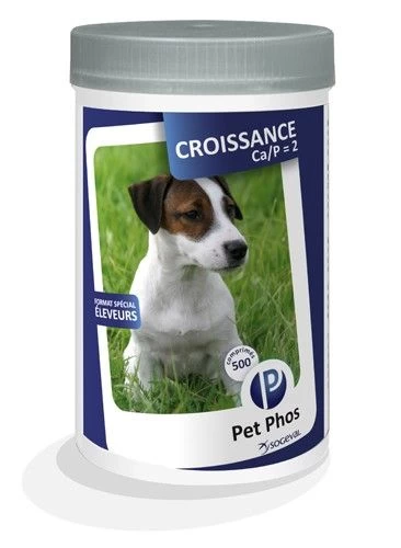 Pet Phos Croissance CA/P=2 est un aliment minéral destiné aux chiots en croissance et aux femelles en lactation ou gestation nourris avec une ration ménagère pour adulte.