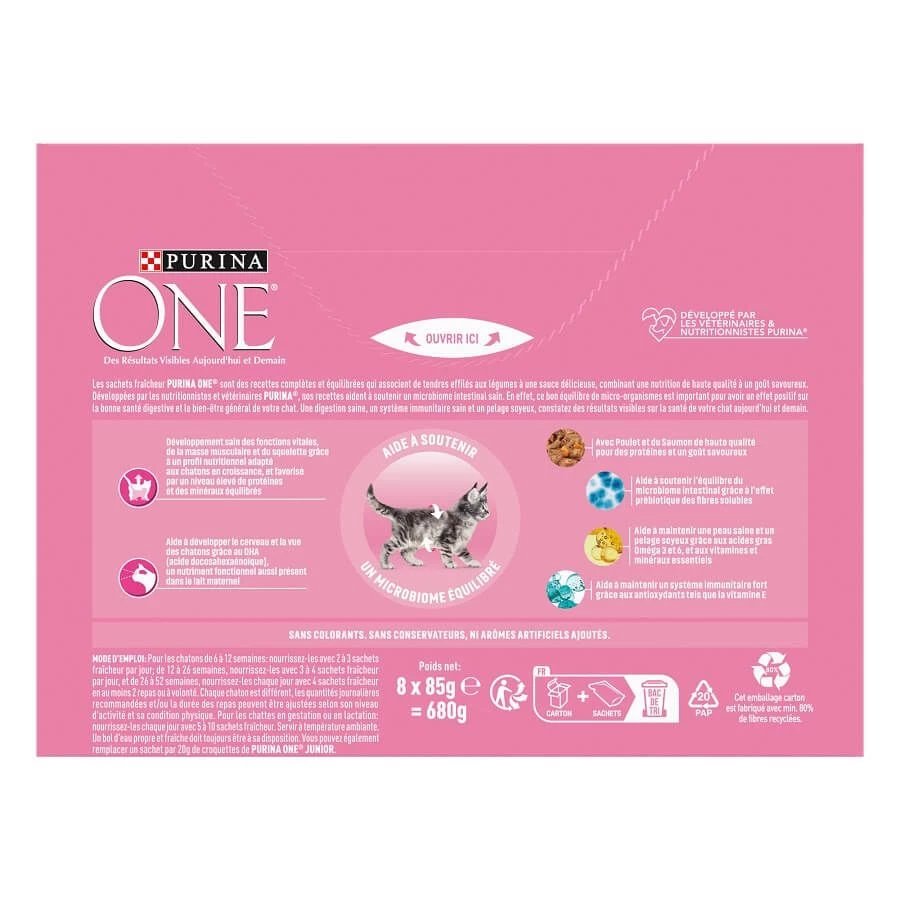Les sachets fraîcheurs Purina One au saumon et au poulet offrent une alimentation complète et équilibrée pour les chatons de 1 à 12 mois ou les chattes en gestation ou en lactation.