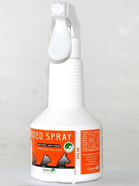 Rhodeo Spray est un anti-parasitaire original associant des extraits naturels de pyrèthre et de géraniol, connus pour leur forte action répulsive.