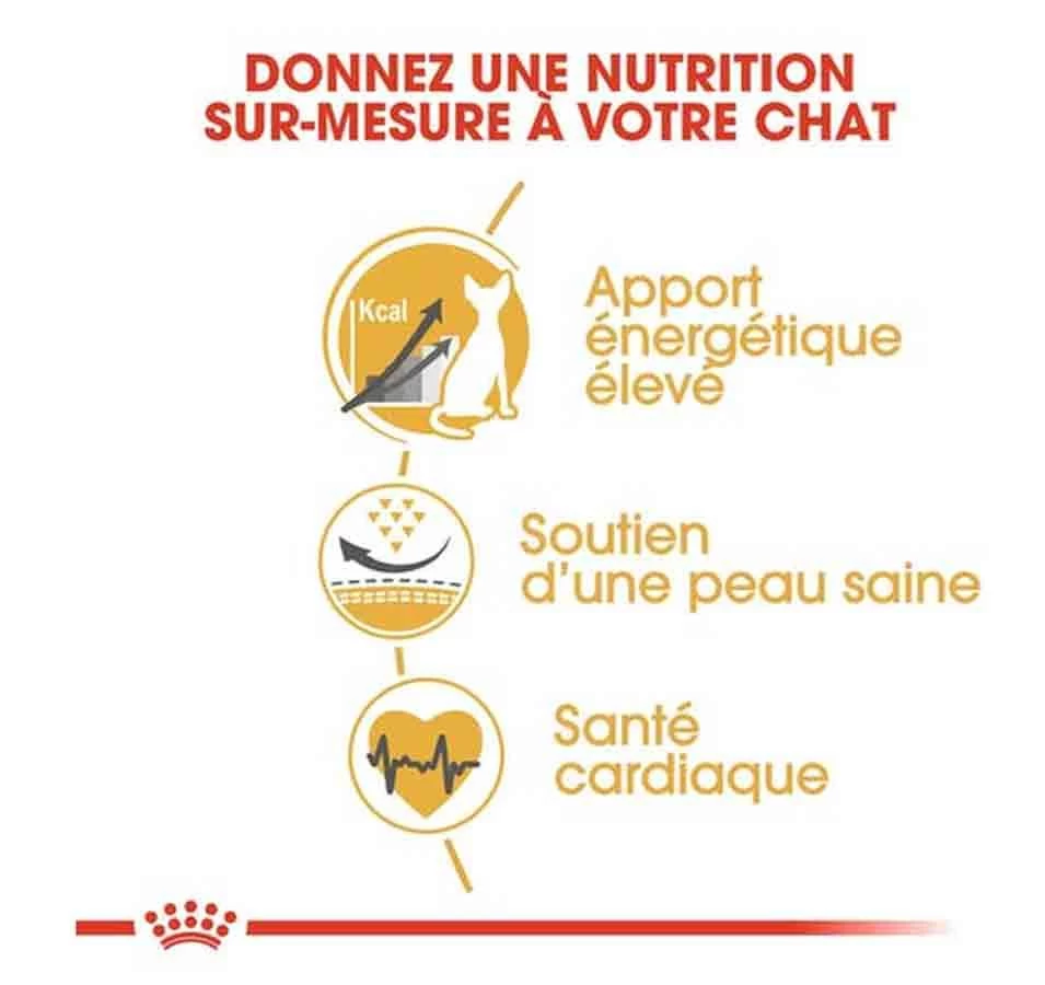 Pour compenser l’absence de poils, le chat Sphynx a un métabolisme très actif qui lui permet de réguler sa température corporelle. Formule hautement calorique avec un niveau élevé de matières grasses (23 %) pour répondre aux besoins énergétiques plus importants de ce chat sans poils.