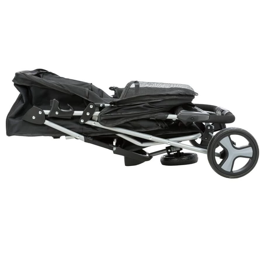 - un mécanisme de fonctionnement à une main avec un roulage souple (grâce à sa légèreté à vide et sa roue avant pivotante avec suspension) ce qui vous permet d’avoir une main libre, tout en poussant votre petit compagnon.