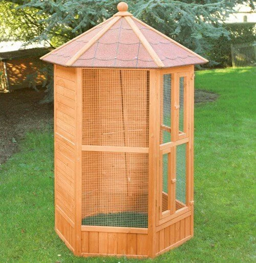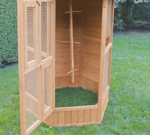 La grande porte de façade comporte 2 petites portes pour pouvoir accéder à la volière sans laisser échapper les oiseaux.